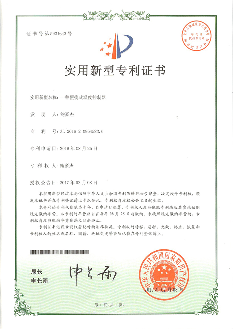 實(shí)用新型專利證書-導(dǎo)軌式溫度控制儀