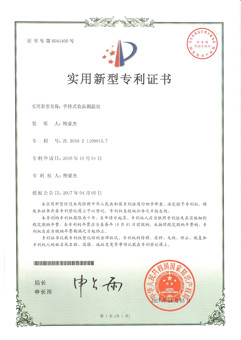 實(shí)用新型專利證書-手持折疊式食品測溫儀
